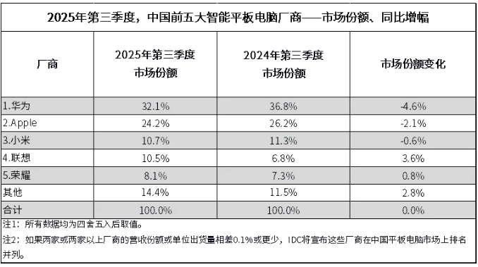 IDC 報告:2025 年 Q3 中國平板電腦市場出貨量 849 萬臺同比增長 10.9%,華為、蘋果、小米前三