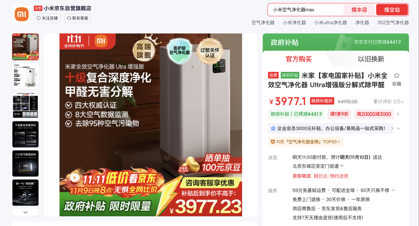 秋冬干燥,空氣中顆粒物增多,呼吸道更需呵護(hù)。小米全效空氣凈化器 Ultra 增強(qiáng)版,創(chuàng)新十級(jí)復(fù)合深度凈化,可有效分解甲醛、二手煙、除細(xì)菌、病毒等95種常見污染物,保持室內(nèi)空氣清新自然。京東11.11期間限時(shí)9折,疊加國(guó)家補(bǔ)貼8折,到手價(jià)3977.1元。