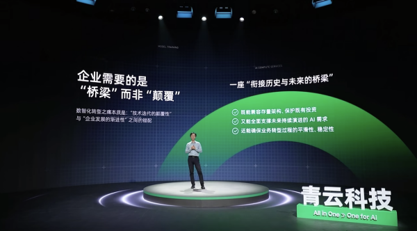 面對企業(yè)客戶的現(xiàn)實(shí)需求,青云給出的轉(zhuǎn)型答案是架設(shè)一座銜接歷史與未來的橋梁。它能夠兼容存量架構(gòu),保護(hù)既有投資,又能全面支持未來持續(xù)演進(jìn)的AI需求,還能確保業(yè)務(wù)轉(zhuǎn)型中的平滑性和穩(wěn)定性。