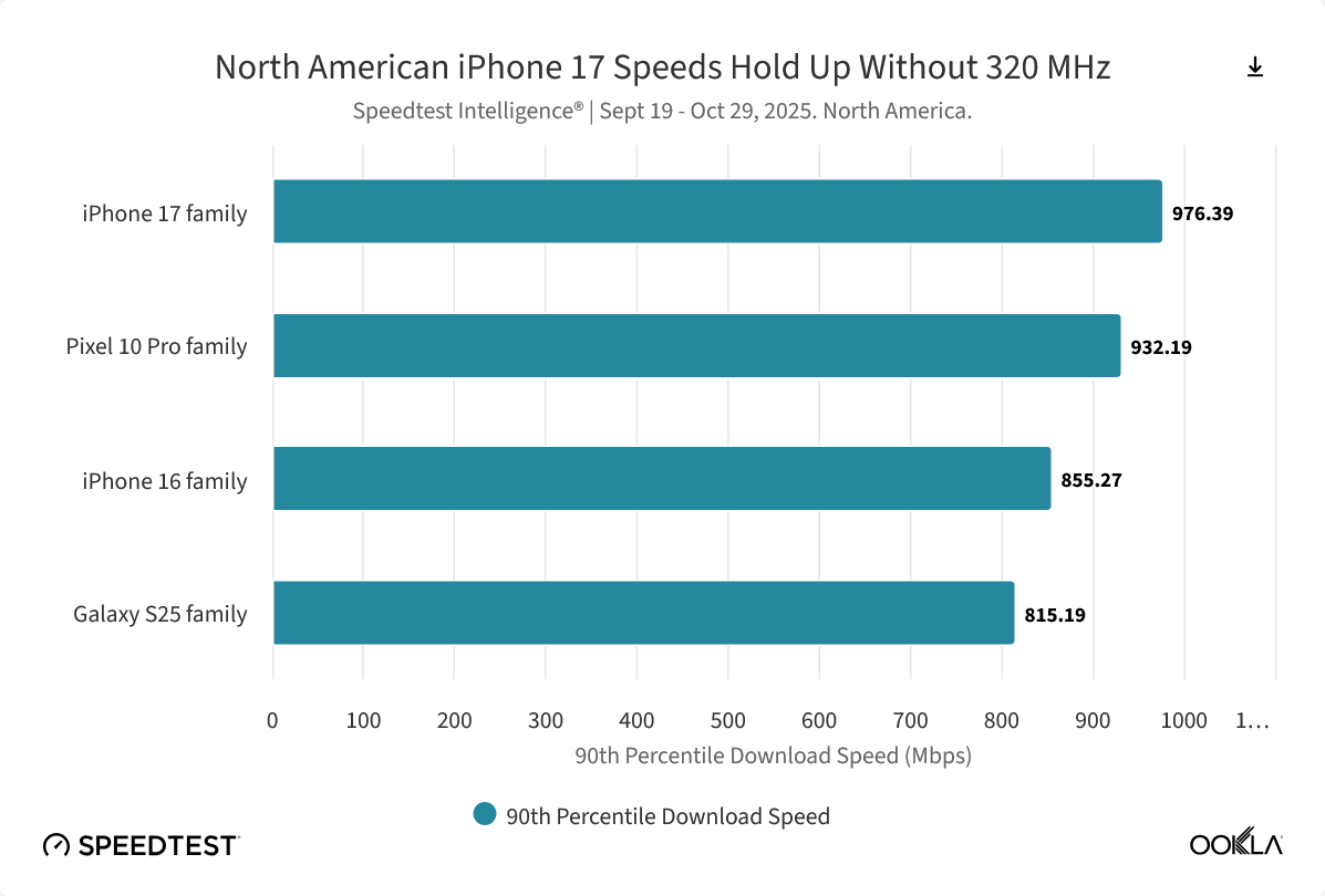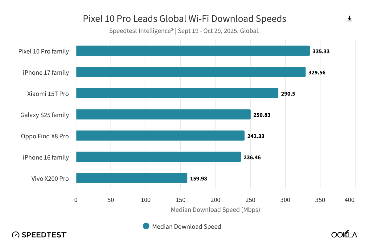 在與安卓旗艦的對(duì)決中,蘋(píng)果并未取得全面領(lǐng)先。谷歌 Pixel 10 Pro 憑借 335.33 Mbps 的全球中位數(shù)下載速度,以微弱優(yōu)勢(shì)險(xiǎn)勝 iPhone 17,成為該項(xiàng)指標(biāo)的冠軍。