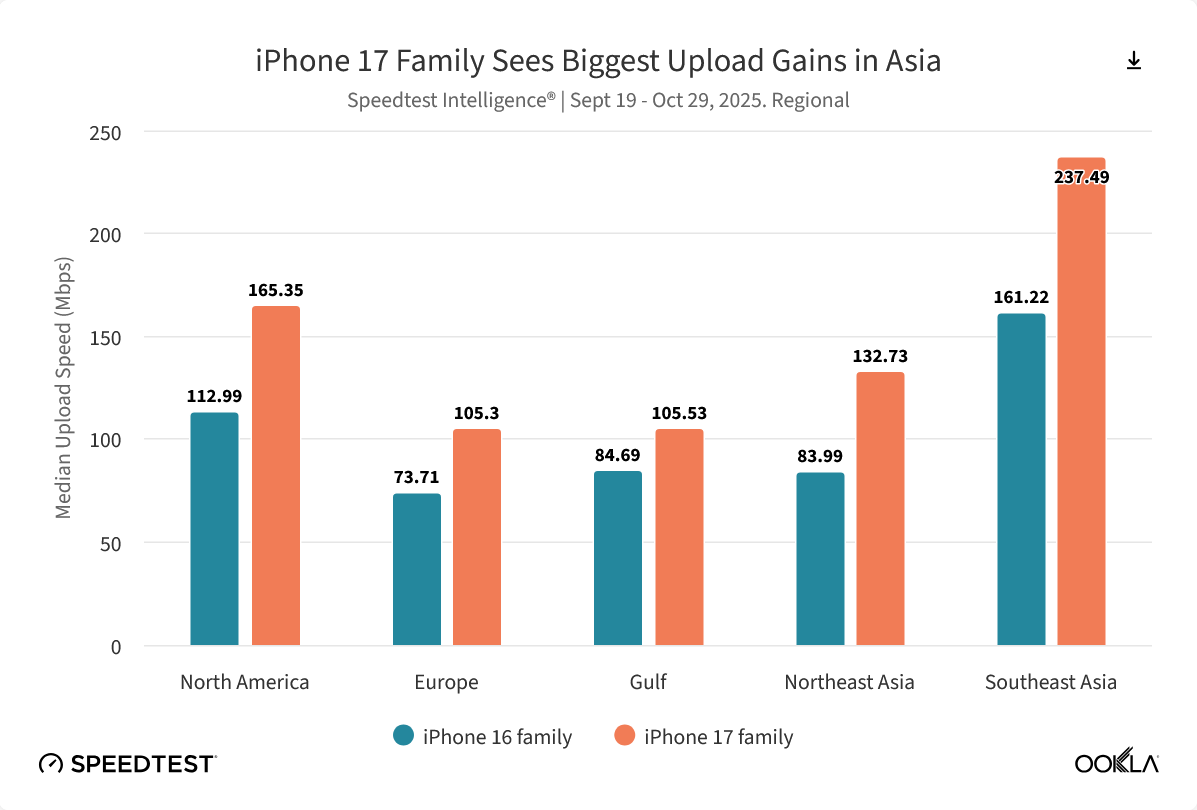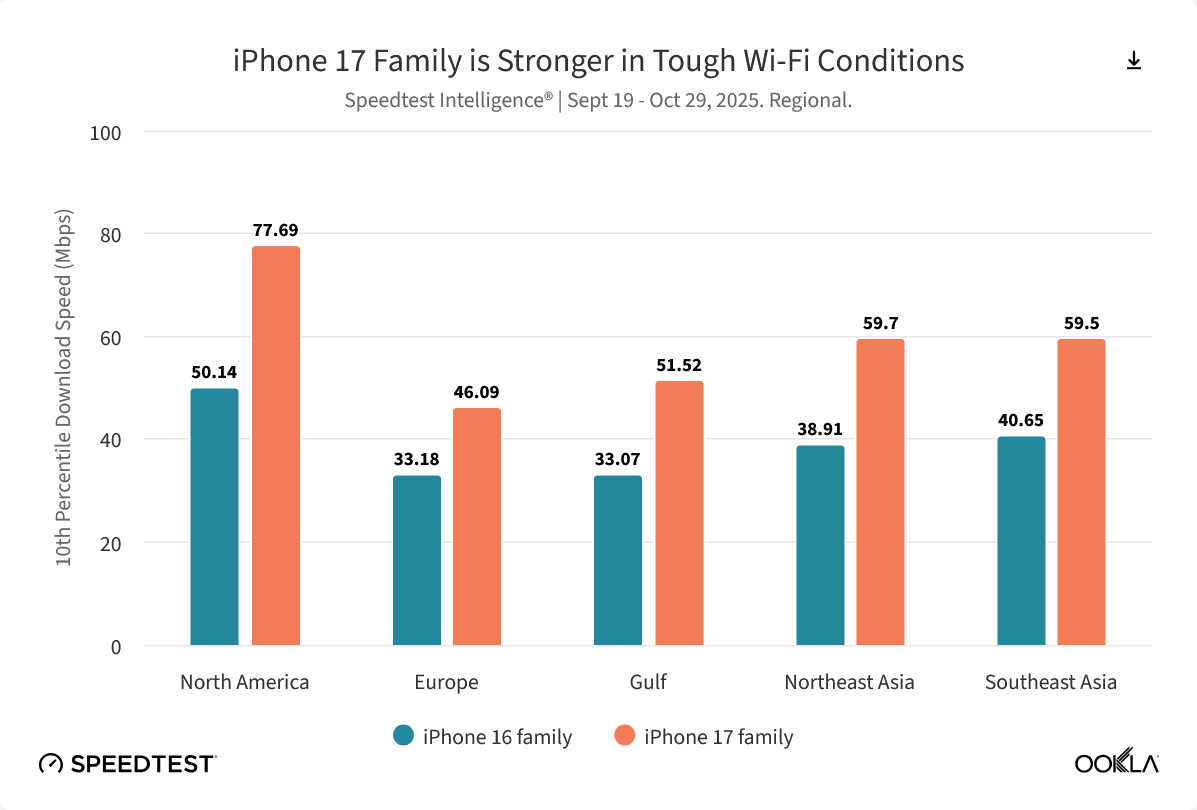 根據(jù) iPhone 17 上市后六周的全球?qū)崪y(cè)數(shù)據(jù),N1 芯片帶來(lái)了質(zhì)的飛躍。與采用博通芯片的 iPhone 16 系列相比,iPhone 17 的全球中位數(shù)下載速度從 236.46 Mbps 提升至 329.56 Mbps,上傳速度也從 73.68 Mbps 躍升至 103.26 Mbps,兩項(xiàng)增幅均高達(dá) 40%。IT之家附上相關(guān)圖片如下:
