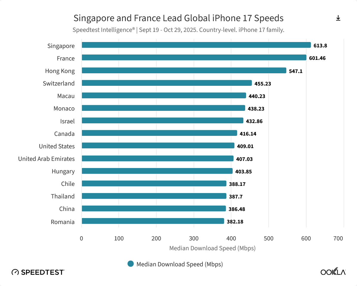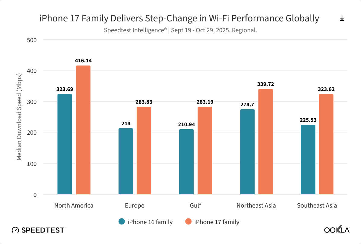 11 月 18 日消息,測(cè)速機(jī)構(gòu) Ookla 昨日(11 月 17 日)發(fā)布最新《Speedtest Intelligence》報(bào)告,指出 2025 年成為 Wi-Fi 技術(shù)競(jìng)爭(zhēng)的關(guān)鍵年份,蘋(píng)果公司正式在 iPhone 17 系列中推出其首款自研無(wú)線(xiàn)網(wǎng)絡(luò)芯片 N1,相比較 iPhone 16 系列,全球上傳和下載中位數(shù)增幅均達(dá)到 40%。