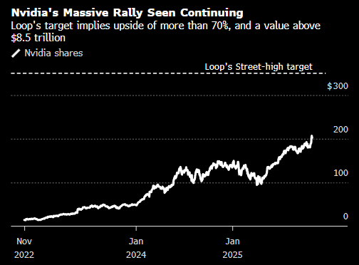 Loop Capital Markets周一將英偉達(dá)目標(biāo)股價(jià)從250美元上調(diào)至350美元,為華爾街當(dāng)前最高預(yù)測(cè)。這一新目標(biāo)相較于英偉達(dá)最新收盤(pán)價(jià)202.49美元高出逾70%,對(duì)應(yīng)的市值將超過(guò)8.5萬(wàn)億美元。當(dāng)前市場(chǎng)對(duì)英偉達(dá)的平均目標(biāo)價(jià)為231美元。