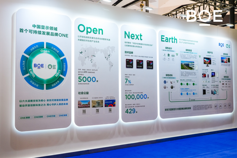 BOE(京東方)堅(jiān)持技術(shù)創(chuàng)新的同時(shí),深度踐行可持續(xù)發(fā)展理念,此次在展會現(xiàn)場呈現(xiàn)的可持續(xù)發(fā)展成果墻也成為焦點(diǎn)之一。在可持續(xù)發(fā)展領(lǐng)域,BOE(京東方)上半年已發(fā)布行業(yè)首個(gè)可持續(xù)發(fā)展品牌“ONE”,以“開放包容(Open)、創(chuàng)新引領(lǐng)(Next)、永續(xù)生態(tài)(Earth)”為核心理念推動生態(tài)共贏;近期又重磅發(fā)布了集團(tuán)可持續(xù)發(fā)展戰(zhàn)略,讓可持續(xù)發(fā)展成為BOE(京東方)的核心競爭力和“第N曲線”新增長極,推動BOE(京東方)從技術(shù)領(lǐng)先邁向可持續(xù)引領(lǐng)的新階段。不僅如此,BOE(京東方)還將可持續(xù)發(fā)展融入企業(yè)發(fā)展的各個(gè)方面,系統(tǒng)規(guī)劃并推進(jìn)“綠色管理、綠色產(chǎn)品、綠色制造、綠色循環(huán)、綠色投資、綠色行動”六大行動路徑,實(shí)現(xiàn)從研發(fā)到制造、從產(chǎn)品到運(yùn)營的全鏈條綠色轉(zhuǎn)型,持續(xù)賦能產(chǎn)業(yè)鏈協(xié)同發(fā)展。在企業(yè)社會責(zé)任方面,BOE(京東方)聚焦教育、環(huán)境、健康、文化領(lǐng)域積極開展公益項(xiàng)目,通過照亮成長路、BOE非遺傳承人守護(hù)計(jì)劃、BOE×UNESCO“科學(xué)十年”倡議合作項(xiàng)目等,踐行對社會可持續(xù)發(fā)展的承諾。
