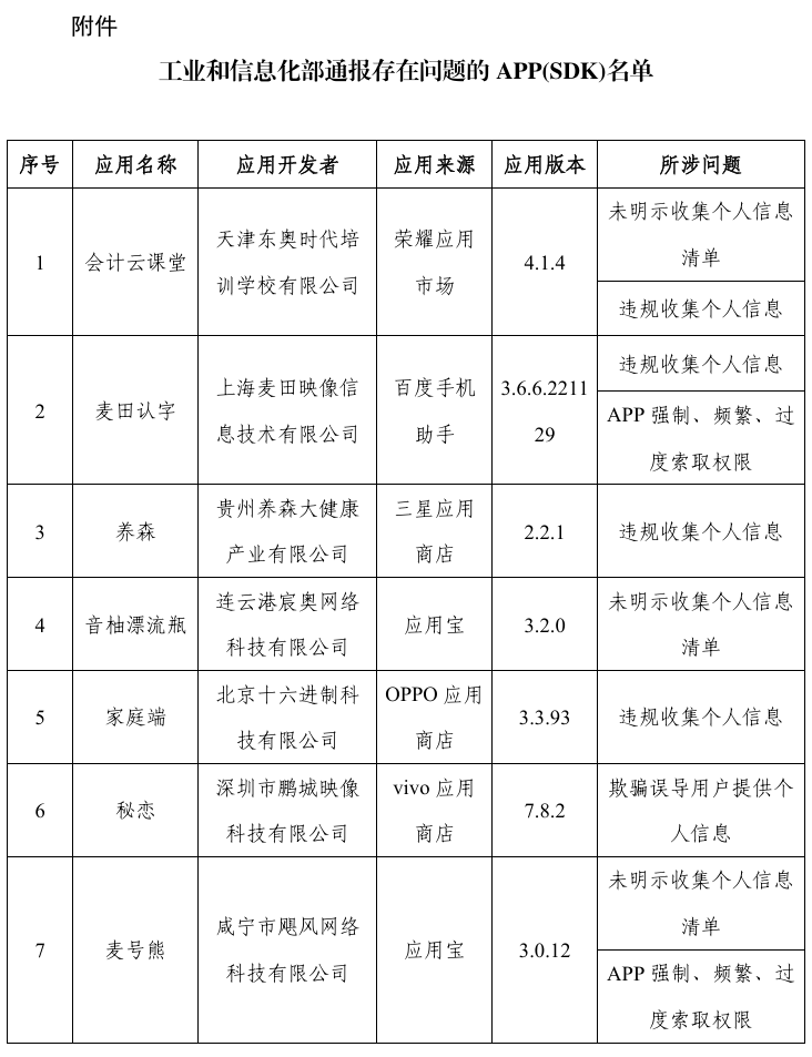 附件:工業(yè)和信息化部通報(bào)存在問題的APP(SDK)名單