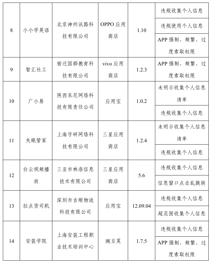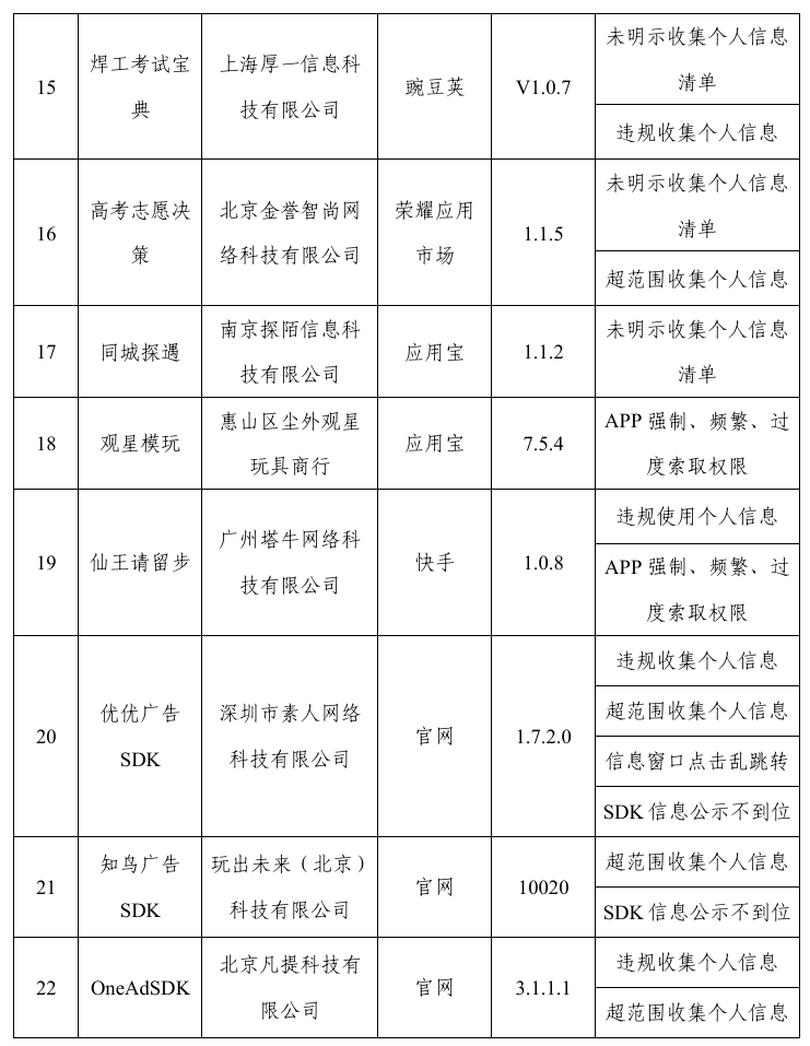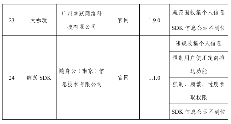 飛象網(wǎng)訊(致新/文)12月10日消息,工信部對(duì)APP、SDK違法違規(guī)收集使用個(gè)人信息等問題開展治理。近期,經(jīng)組織第三方檢測(cè)機(jī)構(gòu)進(jìn)行抽查,共發(fā)現(xiàn)24款A(yù)PP及SDK存在侵害用戶權(quán)益行為(詳見附件),現(xiàn)予以通報(bào)。