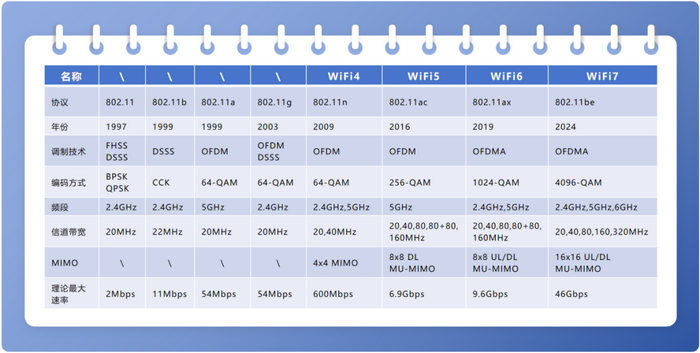 WiFi7 即 IEEE802.11be,EHT (Extremely High Throughput,極高吞吐量)是它的關(guān)鍵字,本文將用通俗語言講清楚WiFi速率計算公式并給出WiFi7的理論峰值計算過程。