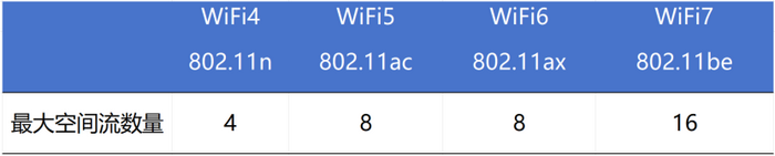 空間流可以理解為設(shè)備的天線,一條空間流對應(yīng)一根天線,空間流越多,則天線越多,整機(jī)吞吐量也越大。根據(jù)以下數(shù)據(jù)得到WiFi7空間流數(shù)最大16條。