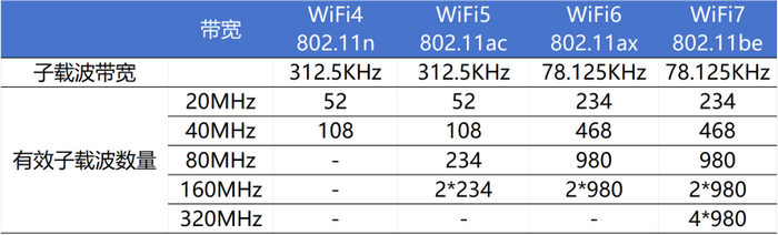 子載波是用于數(shù)據(jù)傳輸?shù)念l域信號,是頻域資源的一部分,不同調(diào)制方式及不同頻寬下的子載波數(shù)量不一樣,和帶寬以及每個子載波的帶寬相關(guān)。根據(jù)以下數(shù)據(jù)得到WiFi7有效子載波數(shù)量最大3920(4*980)。
