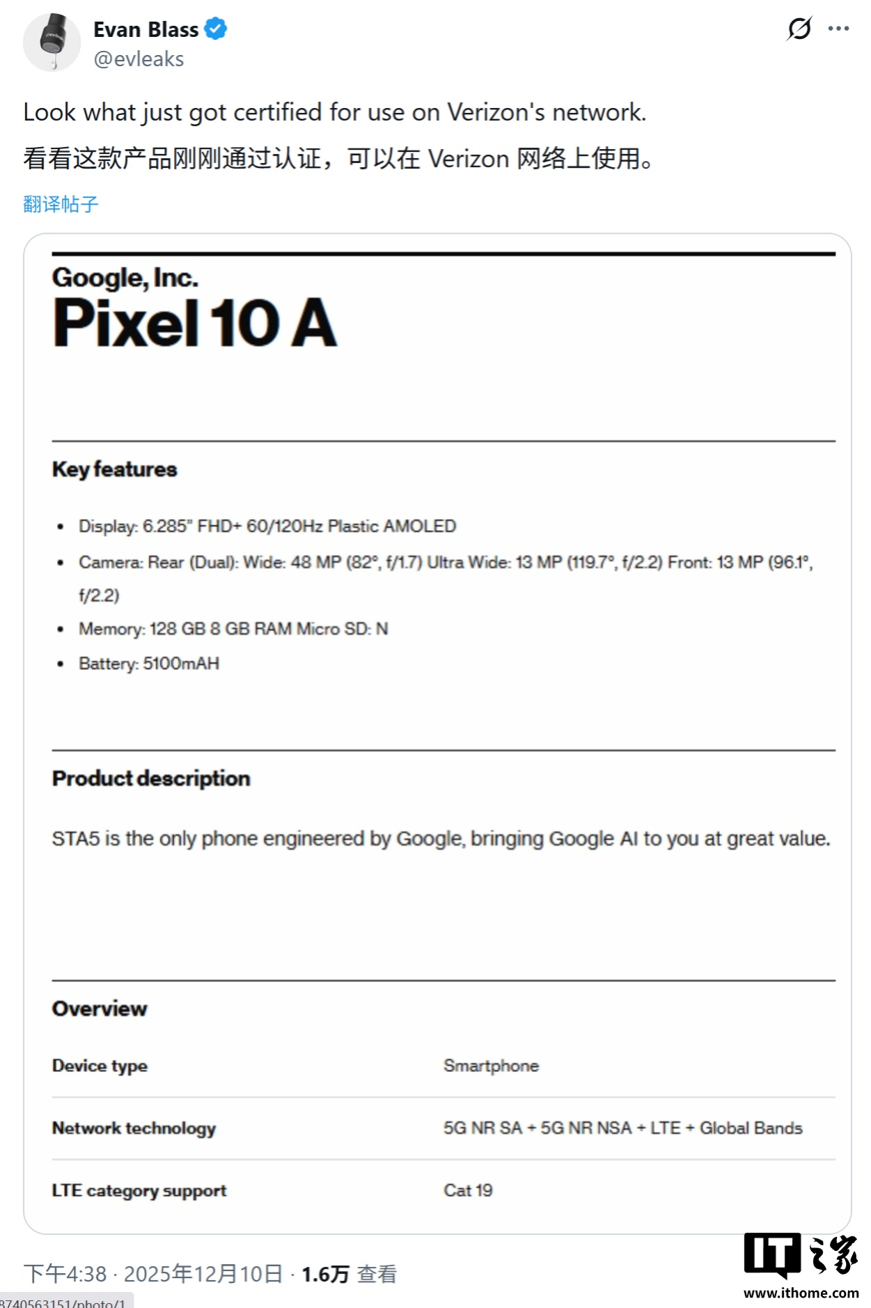 12 月 11 日消息,消息源 Evan Blass 昨日(12 月 10 日)在 X 平臺(tái)發(fā)布推文,分享了一份來(lái)自美國(guó)運(yùn)營(yíng)商 Verizon 的認(rèn)證文件,首次揭示了谷歌 Pixel 10a 手機(jī)的部分核心規(guī)格。