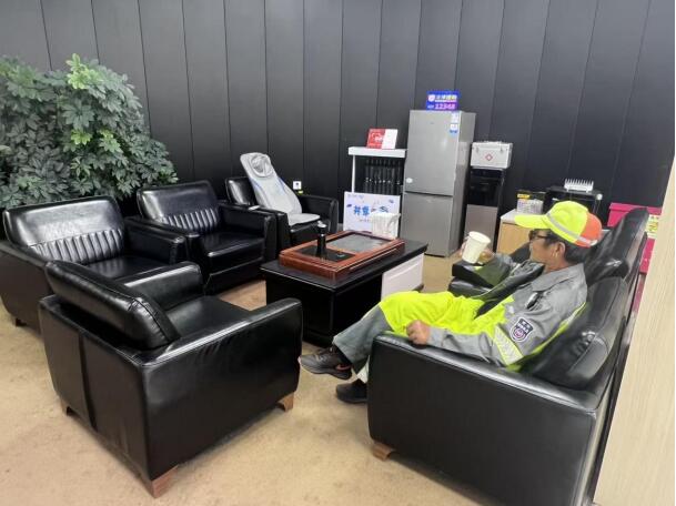走進(jìn)營業(yè)廳的 “愛心驛站”,溫暖的氛圍撲面而來:飲用水、充電插座、急救包、休息座椅、報刊讀物等物資一應(yīng)俱全。環(huán)衛(wèi)工人、出租車司機(jī)、快遞員等戶外勞動者可以到這里喝杯熱水、歇歇腳,再投入一天忙碌的工作。