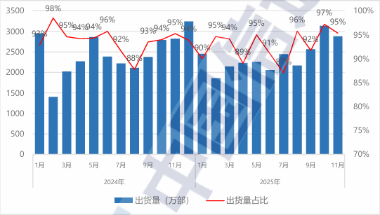 2025 年 11 月,智能手機(jī)出貨量 2875.1 萬部,同比增長 2.0%,占同期手機(jī)出貨量的 95.3%;智能手機(jī)上市新機(jī)型 24 款,同比下降 7.7%,占同期手機(jī)上市新機(jī)型數(shù)量的 77.4%。