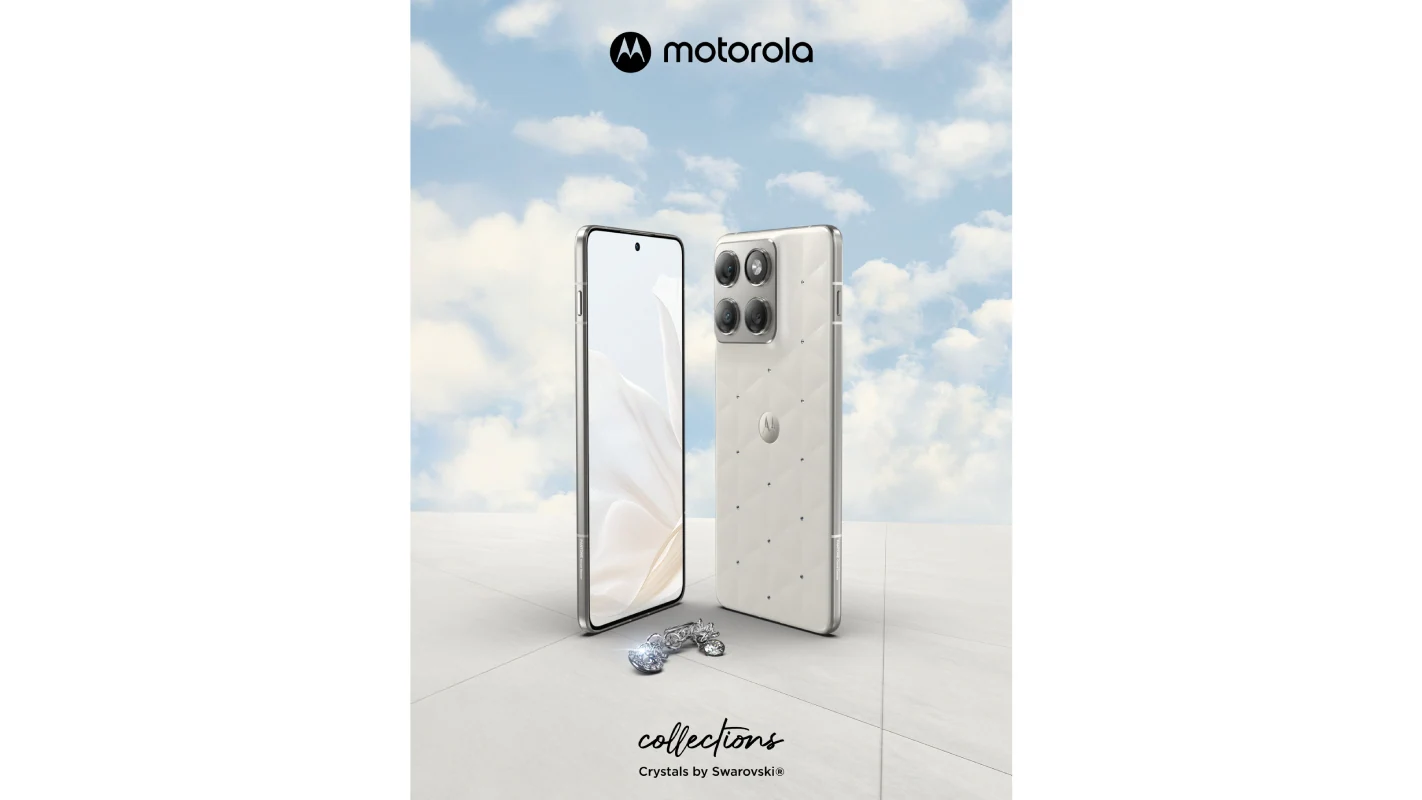 摩托羅拉施華洛世奇特別版 Edge 70 手機亮相:Pantone 2026 年度代表色“云上舞白”,背板鑲嵌水晶