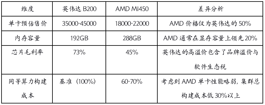 根據(jù)2025年英偉達(dá)與AMD公布的財(cái)報(bào),構(gòu)建簡易模型對(duì)比英偉達(dá)(以B200對(duì)應(yīng)世代產(chǎn)品為例)與AMD(以MI450為例)的單卡成本結(jié)構(gòu)。