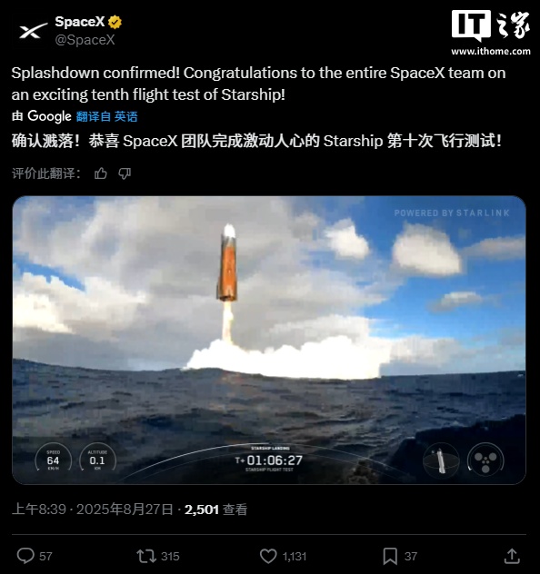 8 月 27 日消息,連續(xù)兩天推遲發(fā)射后,SpaceX 新一代重型運載火箭“星艦”于美國中部時間 8 月 26 日 18 時 30 分從得克薩斯州發(fā)射升空,實施第十次試飛。此次任務(wù)重點目標(biāo)包括讓飛船部署模擬衛(wèi)星、在太空中進(jìn)行發(fā)動機(jī)重新點火測試等。按計劃,火箭助推器將落入墨西哥灣區(qū)域,不返回發(fā)射場。