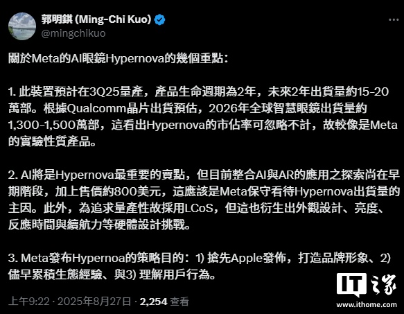 郭明錤在其社交媒體上表示,根據(jù)高通芯片出貨預(yù)估,2026 年全球智能眼鏡出貨量將達(dá)到 1,300-1,500 萬部。因此 Hypernova 的市占率可忽略不計,該產(chǎn)品更像是 Meta 的實(shí)驗(yàn)性產(chǎn)品。