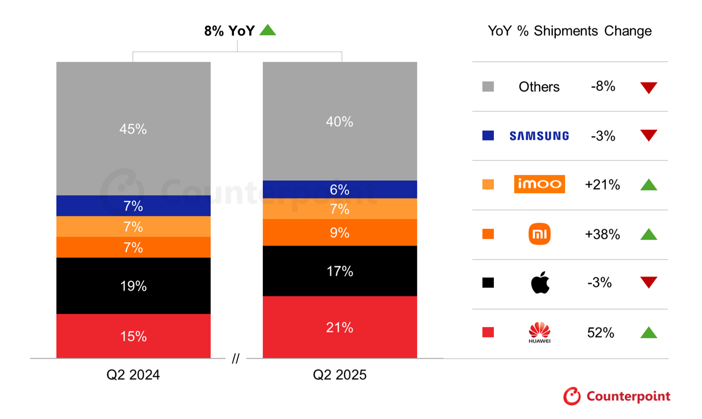 憑借其多樣化的產(chǎn)品組合、強(qiáng)勁的國(guó)內(nèi)勢(shì)頭以及中高端產(chǎn)品具有競(jìng)爭(zhēng)力的價(jià)格,華為首次超越蘋(píng)果,成為全球出貨量的頭把交椅。