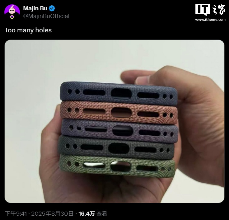 IT之家注意到,Majin Bu 還曝光了 iPhone 17 系列“TechWoven”保護(hù)殼,采用多彩編織面料,可以看到底部開(kāi)孔數(shù)量頗多,預(yù)計(jì)是為新的掛繩配件鋪路。