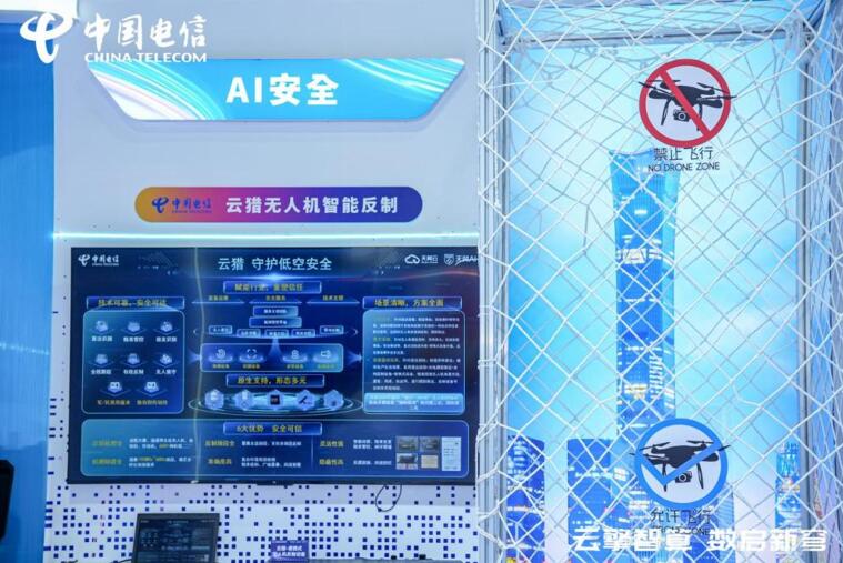 在AI安全展區(qū),“云獵”無人機(jī)反制系統(tǒng)現(xiàn)場上演一場“空中抓捕”:一架模擬“黑飛”的穿越機(jī)剛闖入禁飛區(qū),瞬間被AI偵測到并鎖定,隨即觸發(fā)反制進(jìn)行處置,全程不到3秒。