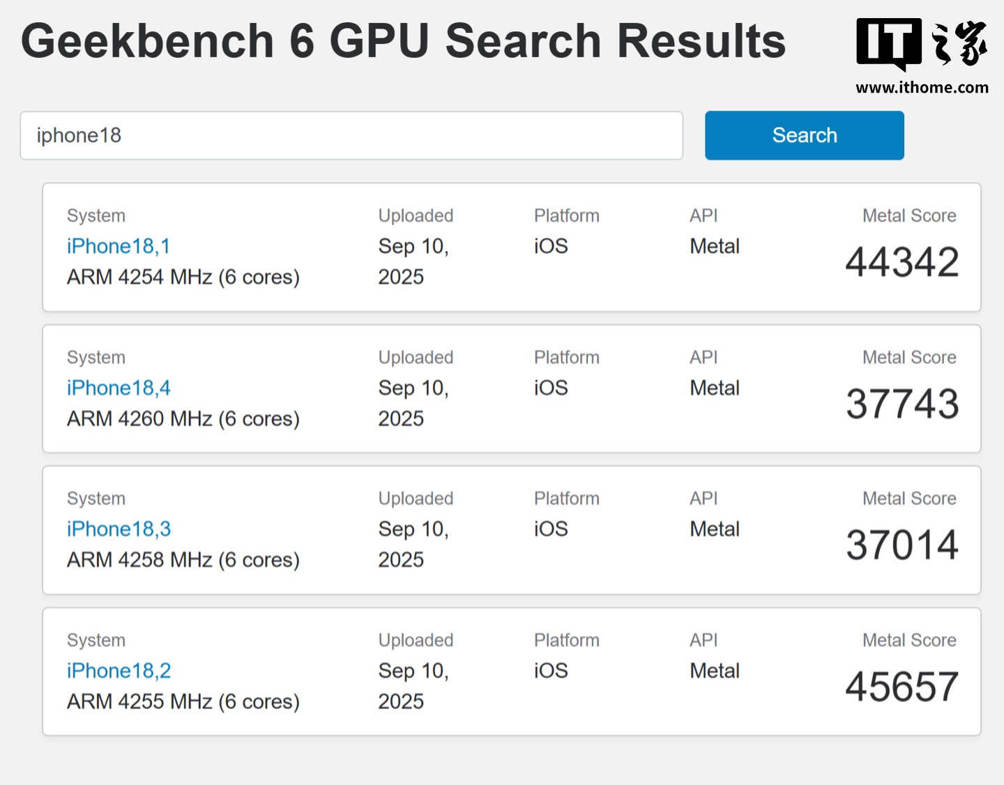 查詢 GeekBench 跑分庫(kù),目前共有 iPhone18,1、iPhone18,2、iPhone18,3 和 iPhone18,4 四條記錄,其中 iPhone18,2 的 Metal 跑分最高,為 45657 分;iPhone18,3 的 Metal 跑分最低,為 37014 分。