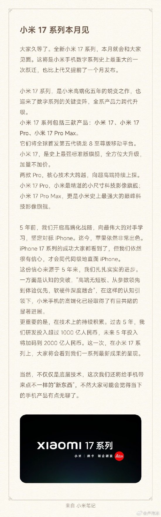 小米集團(tuán)合伙人、總裁,手機(jī)部總裁,小米品牌總經(jīng)理盧偉冰9月15日宣布,全新小米17系列,本月就會和大家見面。