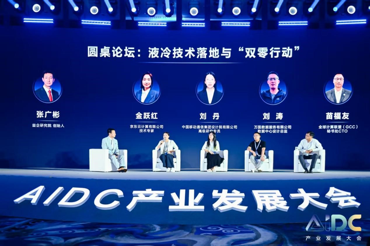 大會最后,在益企研究院張廣彬的主持下,京東云計算有限公司金躍紅、中國移動通信集團設(shè)計院有限公司劉丹、萬國數(shù)據(jù)服務有限公司劉濤、全球計算聯(lián)盟(GCC)苗福友等嘉賓齊聚圓桌論壇,共同探討AIDC的未來發(fā)展。圍繞液冷技術(shù)落地,嘉賓們深入剖析了液冷泄漏、冷板堵塞腐蝕等挑戰(zhàn),并就如何解決液冷工質(zhì)與材料兼容性問題展開討論。此外,嘉賓們還分享了“雙零行動”的創(chuàng)新實踐與最新進展,為AIDC的未來發(fā)展提供思路與指引。
