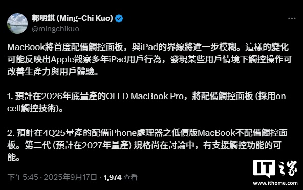 IT之家注意到,郭明錤稱,預(yù)計(jì)在 2026 年底量產(chǎn)的 OLED MacBook Pro 將配備觸控面板。預(yù)計(jì)在今年四季度量產(chǎn)的配備 iPhone 處理器之低價(jià)版 MacBook 不配備觸控面板。第二代規(guī)格尚在討論中,有支持觸控功能的可能。