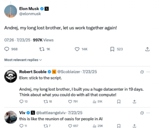 馬斯克對(duì)頂級(jí)人才有多謙遜?為了請(qǐng)?zhí)厮估癆utopilot業(yè)務(wù)負(fù)責(zé)人卡巴奇(Andej Karpathy)回來,馬斯克甚至公開稱卡巴奇是“自己失散多年的兄弟”,懇請(qǐng)他回來和自己一道共事。這或許是他最謙卑主動(dòng)的一刻,僅次于對(duì)特朗普總統(tǒng)的“直男之愛”。