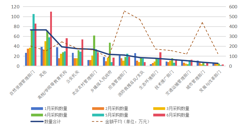 上半年公開投資采購市場整體呈現上升趨勢,自然資源管理和應急管理部門采購需求最為旺盛。上半年公開采購累計發(fā)生1830起,已披露總金額達到39億元。其中五月采購金額位居榜首,占上半年全部采購金額的25%。自然資源管理部門和應急管理部門上半年共計采購13億元,采購金額位居前二。此外,應急管理、消防救援、城市管理等部門財力雄厚,平均采購金額位居前三。