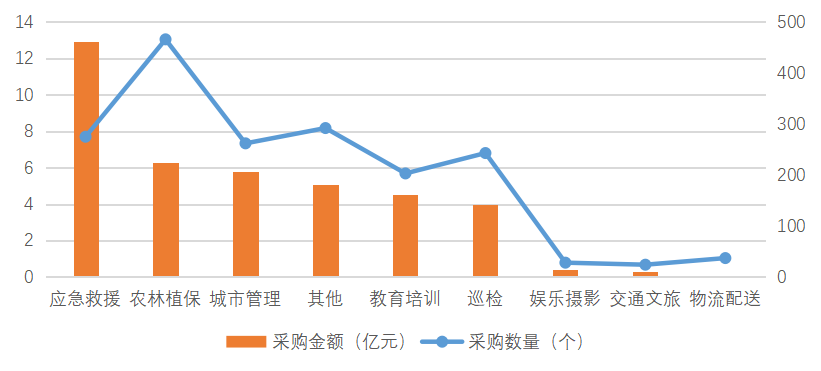 應急救援和農林植保是目前發(fā)展較為成熟的場景,應急救援類相對單價更高。農林植保上半年采購數量最多,共發(fā)生466起;應急救援類場景采購金額最多,超12億元,其中無人機或直升機以及配件等硬件金額占比達90.6%。以政府主導的公共服務類場景如應急救援等大單相對集中,與政策補貼資金流向相同,如應急部門上半僅發(fā)生110次采購,平均每筆采購事件達到555萬元。行業(yè)類采購如農林植保高頻小單較多,部分農業(yè)公司提供防治等服務,服務價格相對采購更低,依據防治面積定價(目前單價≤20元/畝)或隨采購農藥產品搭售。