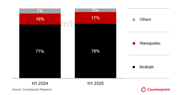 按細分市場來看,基于 Birdbath 方案、以視頻為中心的 AR 智能眼鏡仍然占據(jù)主導(dǎo)地位,占出貨量的 78%,其次是基于光波導(dǎo)(waveguide)、以信息顯示為主的 AR 智能眼鏡,占比約 17%。2025 年上半年基于波導(dǎo)的 AR 智能眼鏡的平均售價(ASP)比更成熟的基于 Birdbath 的產(chǎn)品高出約 27%。