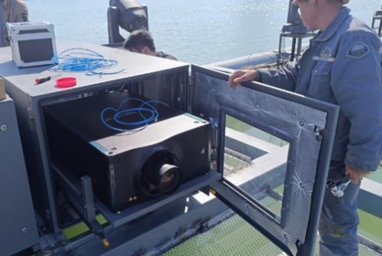作為本次水幕秀投影系統(tǒng)的集成商,北京中清未來科技在Crimson WU32投影機的規(guī)劃、安裝和調(diào)試過程中發(fā)揮了關鍵作用。這些安裝在湖心浮排上的投影機面臨著大量水霧和濕氣的挑戰(zhàn)。為此,項目團隊為其定制了配備恒溫與冷卻系統(tǒng)的防水外殼,有效調(diào)節(jié)內(nèi)部溫濕度,使其免受環(huán)境侵蝕,確保在各種天氣條件下穩(wěn)定運行。