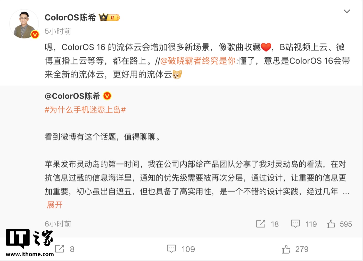 9 月 4 日消息,OPPO ColorOS 設計總監(jiān)陳希今天下午在微博發(fā)文談“為什么手機迷戀上島”,其表示,看到微博有這個話題,值得聊聊。