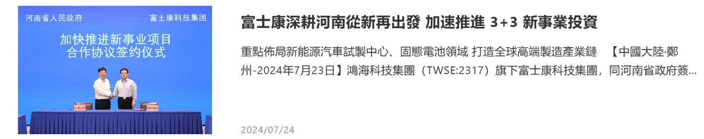 2024 年 7 月 23 日,鴻海子公司富士康科技集團(tuán)同河南省政府簽署《河南省政府與富士康科技集團(tuán)加快推進(jìn)新事業(yè)項(xiàng)目戰(zhàn)略合作協(xié)議》。