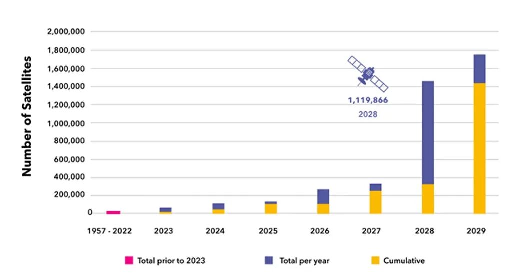 與此同時(shí),軌道與頻段資源的爭(zhēng)奪已進(jìn)入白熱化階段,ITU報(bào)告顯示成員國(guó)申請(qǐng)登記無線電頻率的非對(duì)地靜止衛(wèi)星數(shù)量將在2029年達(dá)到近180萬顆。地球同步軌道和黃金頻段的容量本就有限,過度發(fā)射不僅會(huì)引發(fā)軌道擁堵和衛(wèi)星碰撞的潛在風(fēng)險(xiǎn),而國(guó)際電信聯(lián)盟(ITU)“先到先得” 的規(guī)則,更進(jìn)一步加劇了這種無序競(jìng)爭(zhēng)。