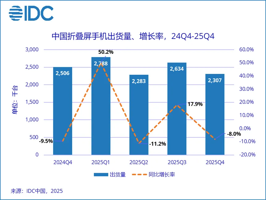 在折疊屏手機細分市場,2025 年第四季度出貨量為 231 萬臺,同比下降 8.0%,市場呈現(xiàn)階段性回調。全年折疊屏手機出貨量約 1001 萬臺,同比增長 9.2%,但增速已有所放緩。
