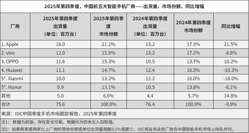 IDC:華為重返 2025 年中國智能手機市場出貨榜首,蘋果 iPhone 17 系列創(chuàng) Q4 單季新高、小米連續(xù)兩年實現(xiàn)增長