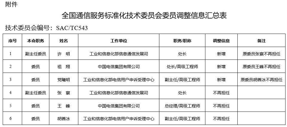 飛象網(wǎng)訊(致新/文)1月23日消息,工信部科技司表示,根據(jù)工作需要,有關(guān)單位提出了全國通信服務(wù)標(biāo)準(zhǔn)化技術(shù)委員會委員調(diào)整。為進(jìn)一步聽取各方意見,現(xiàn)將委員調(diào)整信息予以公示。如有不同意見,請在公示期間將意見反饋至我司,電子版請發(fā)送至KJBZ@miit.gov.cn(郵件主題標(biāo)明:全國通信服務(wù)標(biāo)準(zhǔn)化技術(shù)委員會委員調(diào)整公示反饋)。