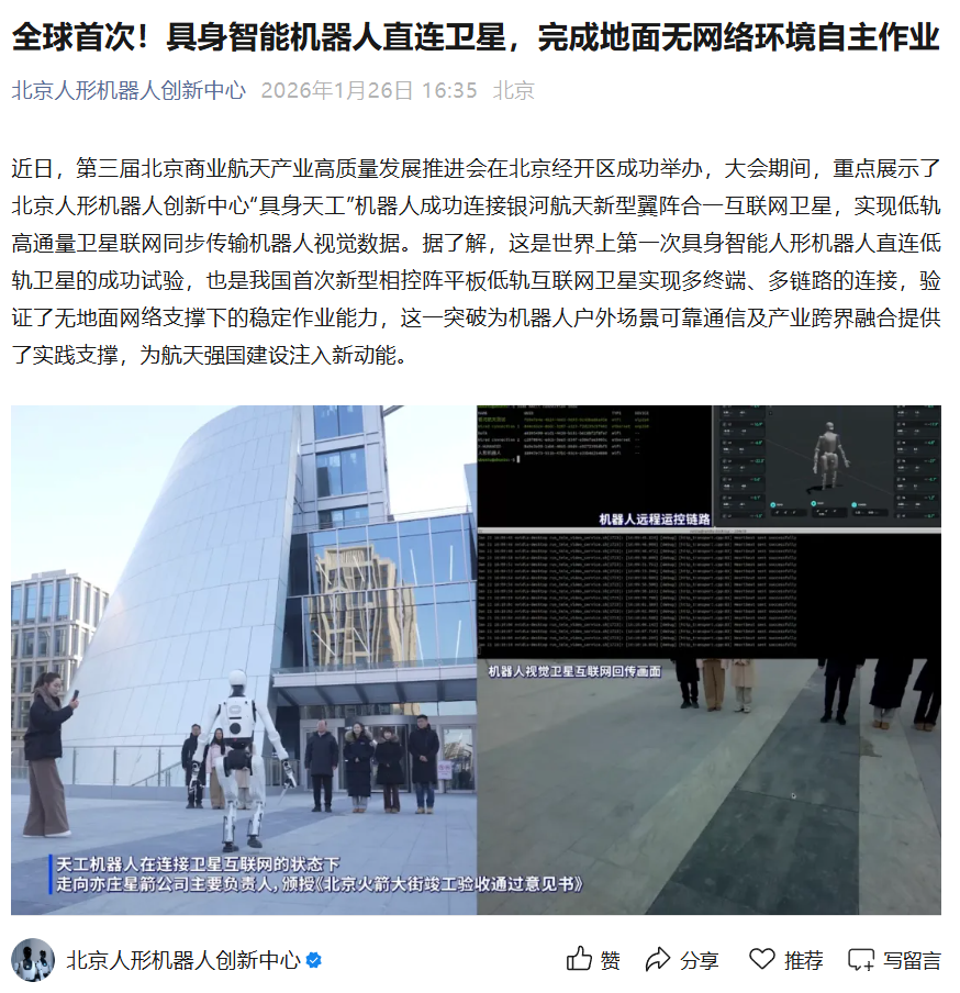 據(jù)北京人形機(jī)器人創(chuàng)新中心官方今日公告,這是世界上第一次具身智能人形機(jī)器人直連低軌衛(wèi)星的成功試驗(yàn),也是我國首次新型相控陣平板低軌互聯(lián)網(wǎng)衛(wèi)星實(shí)現(xiàn)多終端、多鏈路的連接,驗(yàn)證了無地面網(wǎng)絡(luò)支撐下的穩(wěn)定作業(yè)能力。