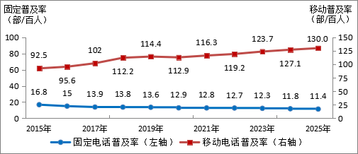 圖2-1  2015—2025年固定電話及移動電話普及率發(fā)展情況