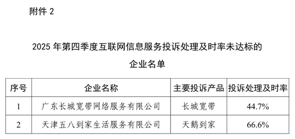 在互聯(lián)網(wǎng)信息服務(wù)投訴方面,2025年第四季度,互聯(lián)網(wǎng)信息服務(wù)投訴平臺收到的互聯(lián)網(wǎng)用戶投訴中,服務(wù)功能類投訴占比46.2%,個(gè)人信息保護(hù)類投訴占比18.6%,客服渠道類投訴占比15.5%。在178家頭部互聯(lián)網(wǎng)企業(yè)中,廣東長城寬帶、天鵝到家等2家企業(yè)投訴處理及時(shí)率較低,已督促相關(guān)企業(yè)妥善處理用戶反映的問題。