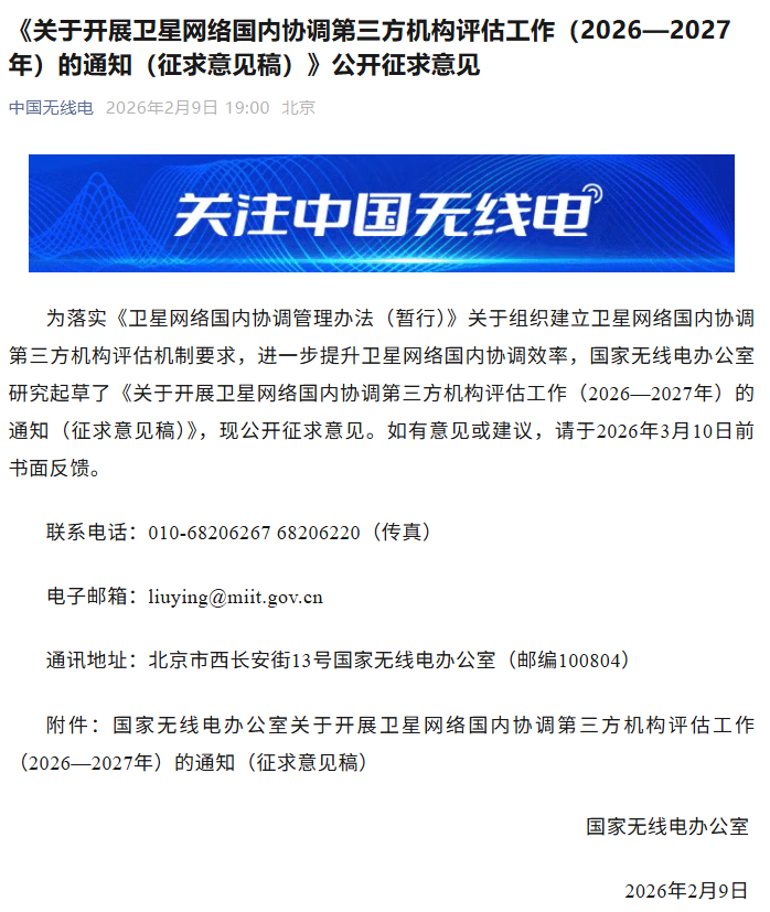 2 月 9 日消息,今日,國(guó)家無(wú)線電辦公室發(fā)布通知,為落實(shí)《衛(wèi)星網(wǎng)絡(luò)國(guó)內(nèi)協(xié)調(diào)管理辦法(暫行)》關(guān)于組織建立衛(wèi)星網(wǎng)絡(luò)國(guó)內(nèi)協(xié)調(diào)第三方機(jī)構(gòu)評(píng)估機(jī)制要求,進(jìn)一步提升衛(wèi)星網(wǎng)絡(luò)國(guó)內(nèi)協(xié)調(diào)效率,國(guó)家無(wú)線電辦公室研究起草了《關(guān)于開展衛(wèi)星網(wǎng)絡(luò)國(guó)內(nèi)協(xié)調(diào)第三方機(jī)構(gòu)評(píng)估工作(2026—2027 年)的通知(征求意見稿)》,現(xiàn)公開征求意見。