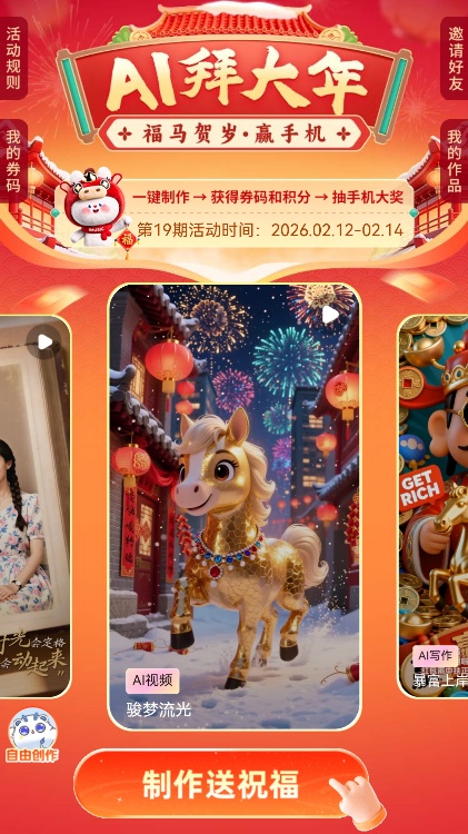 打開小程序,春節(jié)氛圍撲面而來。“八方來財”“馬上大吉”“馬上轉(zhuǎn)運”……的吉祥話、“卡通拜年合家歡”“Horse(好事)成雙”的拜年場景……一片紅紅火火。