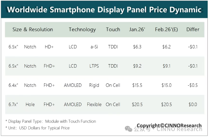 2 月 23 日消息,據(jù) CINNO Research 最新報(bào)告,受春節(jié)假期及傳統(tǒng)淡季影響,2026 年 2 月手機(jī)市場整體表現(xiàn)低迷。與此同時(shí),上游存儲器價(jià)格持續(xù)大幅上漲,顯著推高整機(jī) BOM 成本,終端品牌紛紛下調(diào)出貨目標(biāo)以控制成本。在此背景下,手機(jī)面板市場延續(xù)疲軟態(tài)勢,各技術(shù)類型的手機(jī)面板價(jià)格均面臨不同程度的下行壓力。