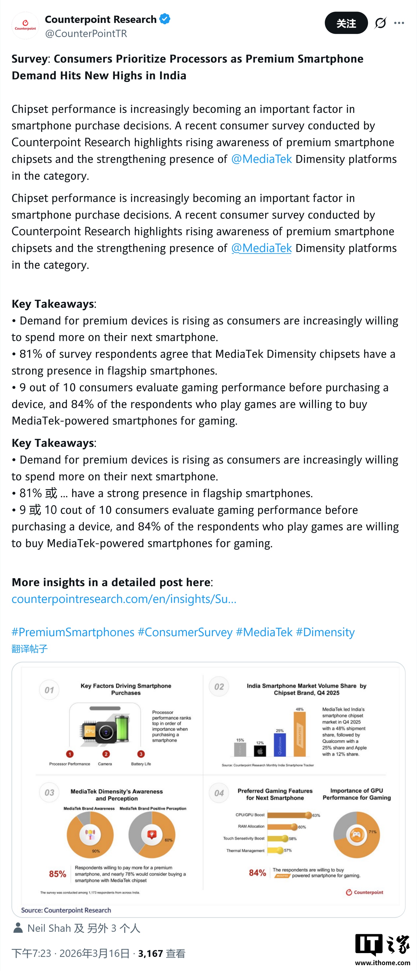 CounterPoint 稱聯(lián)發(fā)科高端化戰(zhàn)略成效顯著,2025Q4 印度手機(jī)市場(chǎng)斬獲 48% 份額