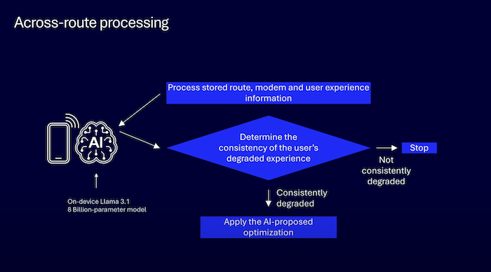 在隨后的行程中,通過高通在端側(cè)運行的Llama 3.1模型,AI智能體將類似的視頻凍結(jié)事件記錄到其“情節(jié)記憶”中,識別出這是一種在特定位置發(fā)生的固定現(xiàn)象,而非偶然的網(wǎng)絡(luò)波動。通過數(shù)據(jù)推理,AI智能體發(fā)現(xiàn)視頻凍結(jié)的原因是設(shè)備在4G與5G網(wǎng)絡(luò)之間的頻繁切換。于是,AI智能體提出建議,當(dāng)設(shè)備處于該地下停車場位置時,應(yīng)保持在5G網(wǎng)絡(luò)而不切換到4G。在之后的行程中,應(yīng)用該優(yōu)化方案后,視頻通話不再出現(xiàn)凍結(jié)現(xiàn)象。
