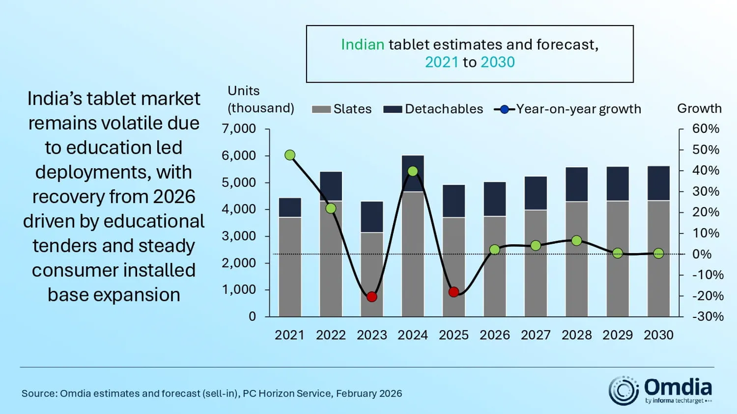 另一方面,由于商用市場(chǎng)的逆風(fēng)顯著強(qiáng)于消費(fèi)市場(chǎng)的增長(zhǎng),印度市場(chǎng)的平板電腦出貨在 2025 年出現(xiàn)了 18% 的下滑,降至 493.4 萬(wàn)臺(tái)。機(jī)構(gòu)預(yù)計(jì) 2026 年將小幅回升至 503.8 萬(wàn)臺(tái)。