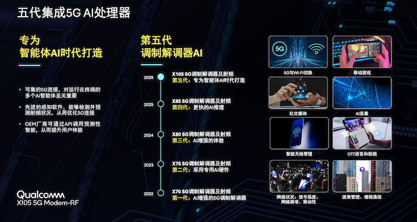 高通X105內(nèi)置的第五代5G AI處理器,專為智能體AI時代打造,能夠利用調(diào)制解調(diào)器內(nèi)的智能體AI實現(xiàn)連接能力提升。先進(jìn)的感知軟件,能夠檢測并預(yù)測射頻狀況,從而優(yōu)化5G連接。OEM廠商可通過API調(diào)用預(yù)測性智能,最終提升不同用戶場景下的性能,帶來卓越的5G-A性能與用戶體驗。