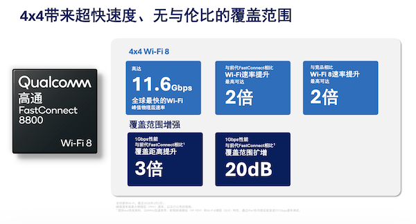 高通發(fā)布的高通FastConnect 8800移動連接系統(tǒng),具備多個領(lǐng)先特性。它是迄今為止全球速度最快、覆蓋距離最遠(yuǎn)的移動Wi‑Fi方案,峰值物理層速率可達(dá)11.6Gbps,也是全球唯一一款將Wi‑Fi 8、藍(lán)牙7、最新UWB與最新Thread等下一代連接技術(shù)集成于單一芯片的解決方案。同時,它還采用了近距離感知技術(shù),并通過系統(tǒng)級AI優(yōu)化加以增強。