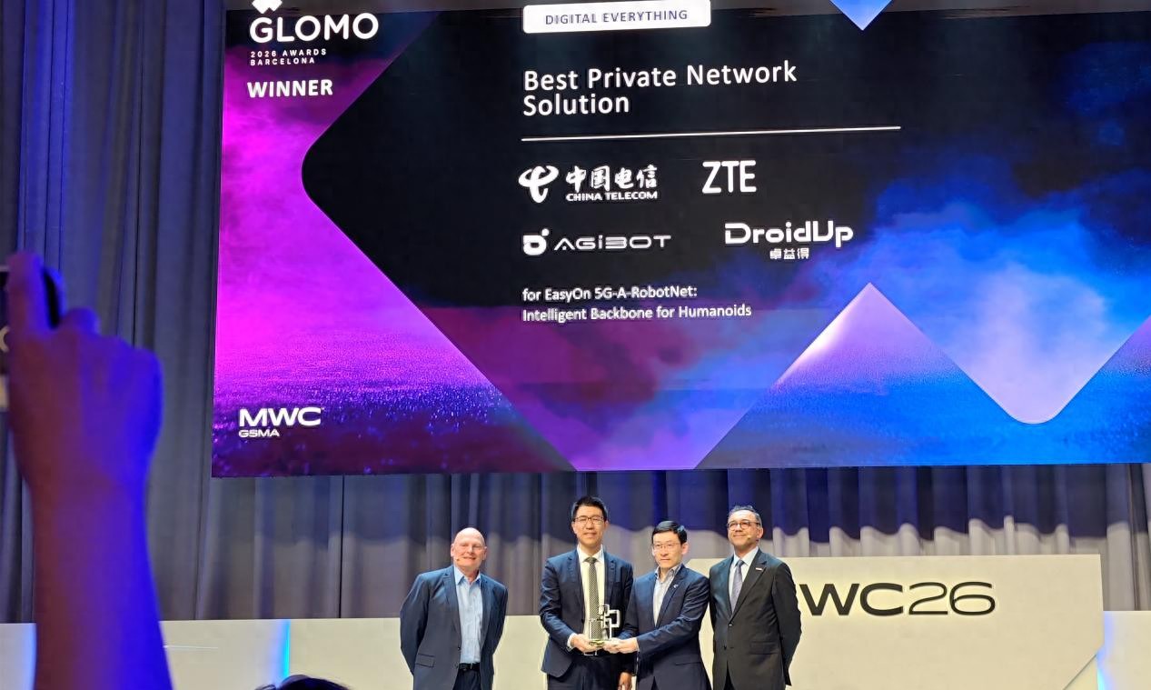 2026年世界移動(dòng)通信大會(huì)(MWC26)期間,備受矚目的GSMA全球移動(dòng)大獎(jiǎng)(GLOMO Awards)正式揭曉。中國(guó)電信上海公司(以下簡(jiǎn)稱“上海電信”)攜手中興通訊、智元機(jī)器人、卓益得機(jī)器人,憑借創(chuàng)新方案“EasyOn 5G-A RobotNet”,一舉摘得“最佳專網(wǎng)解決方案獎(jiǎng)”(Best Private Network Solution)。這一殊榮不僅有力印證了中國(guó)電信在5G-A與具身智能融合領(lǐng)域的創(chuàng)新實(shí)力,也充分體現(xiàn)了上海電信聚合產(chǎn)業(yè)生態(tài)、推動(dòng)AI+戰(zhàn)略落地取得的實(shí)質(zhì)性成果。